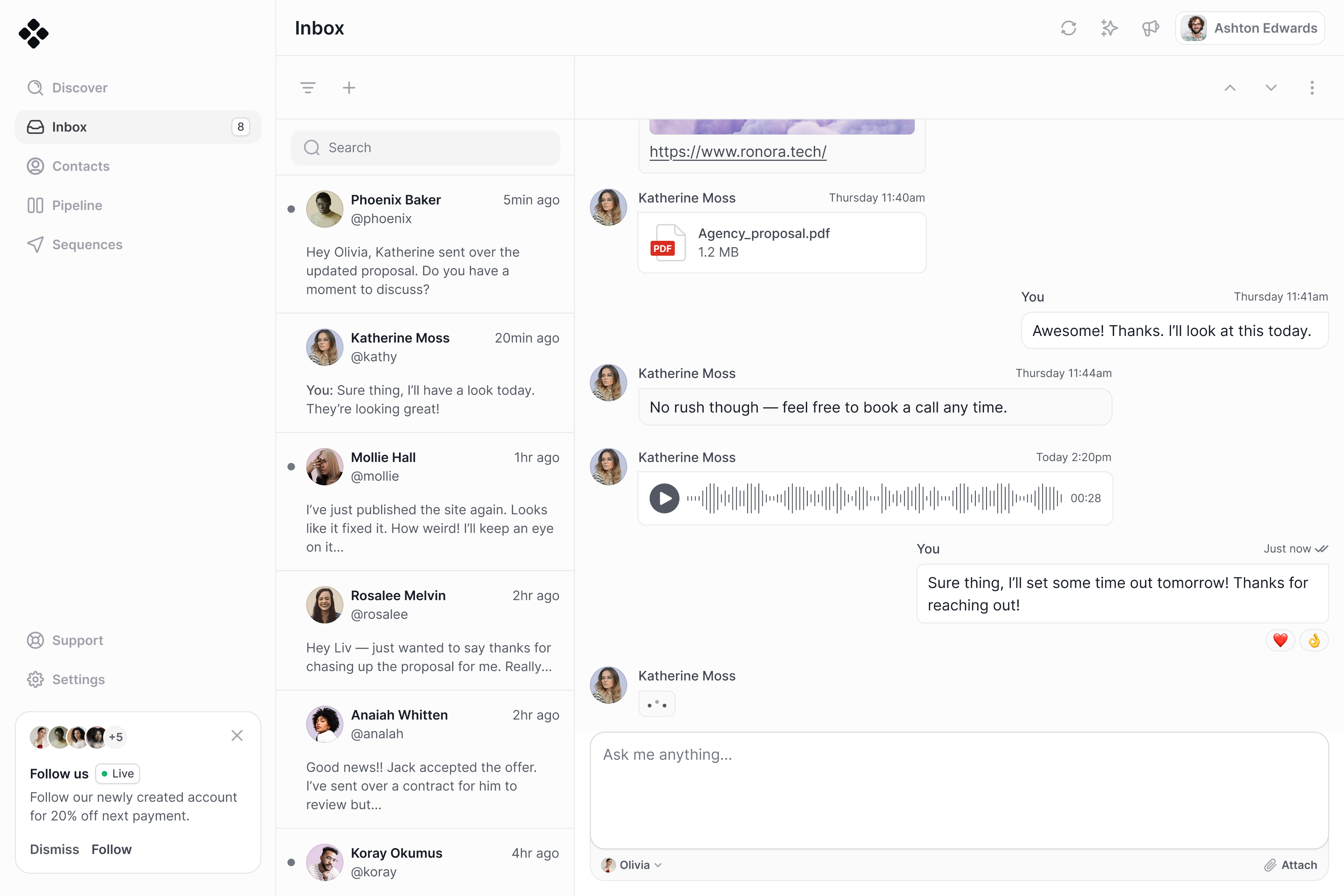 Yes. Ronora includes sequence-based outreach so you can structure follow-ups, manage message timing, and keep outreach consistent while maintaining a personal feel.