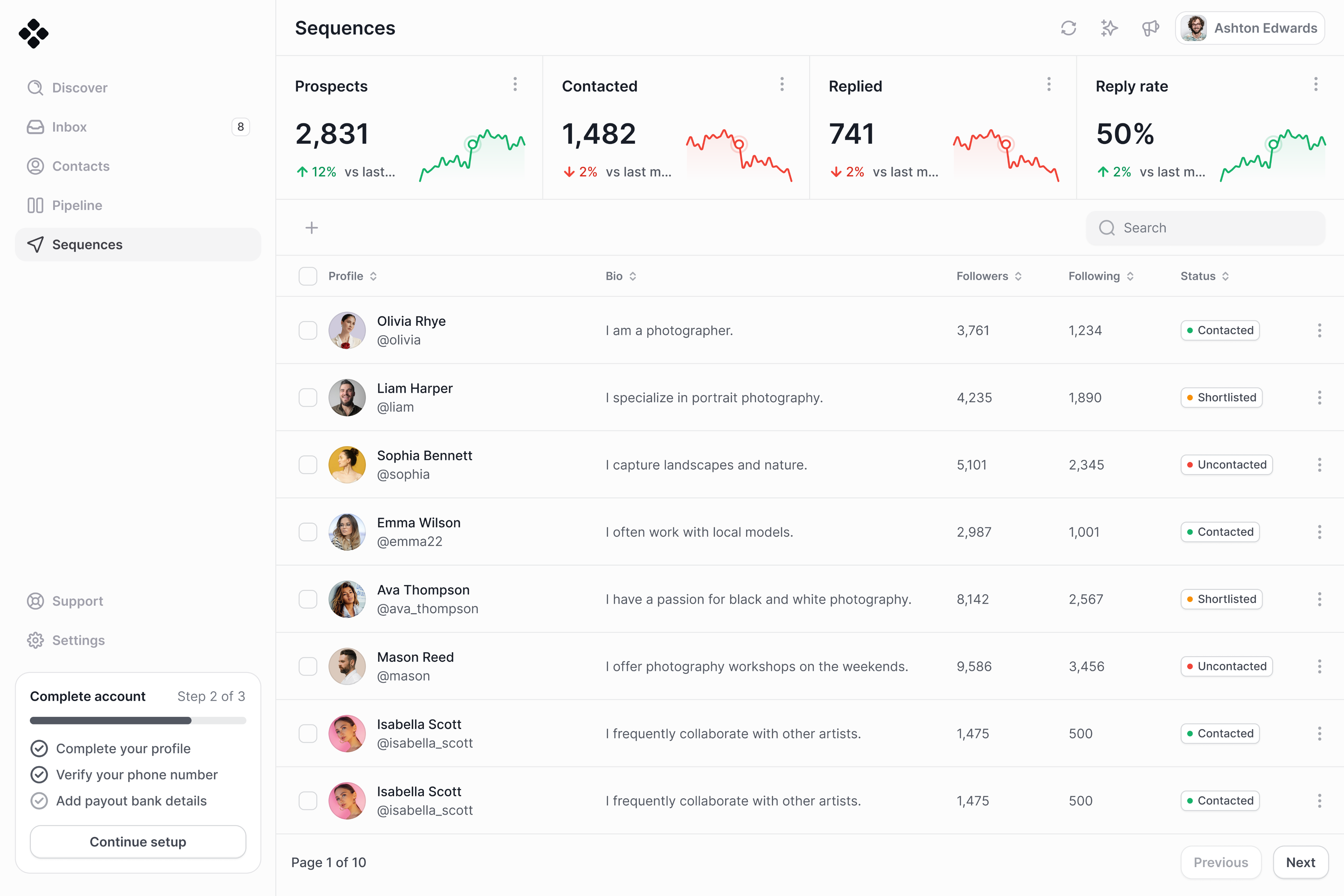 Ronora helps you discover leads through multiple sourcing methods, including bio keywords, post keywords, follower graphs, and following graphs — so you can find people based on relevance.